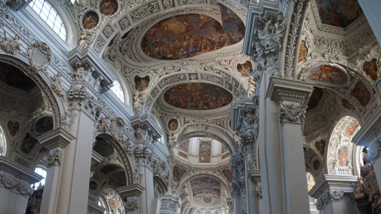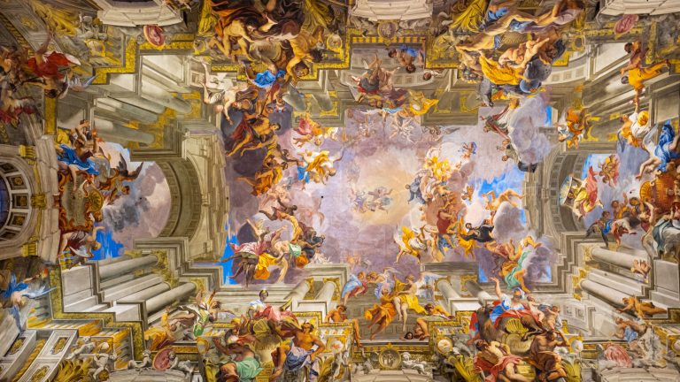 Trần nhà và các bức tường được trang trí bằng những bức bích họa đồ sộ, mang lại cảm giác nguy nga và tráng lệ, nhờ vào sự kỳ công và màu sắc sống động của chúng. Không gian nội thất trở thành một phòng trưng bày sống động với các tác phẩm hội họa, điêu khắc và nghệ thuật tạo hình nổi bật, phản ánh phong cách nghệ thuật phóng khoáng đặc trưng của kiến trúc Baroque.